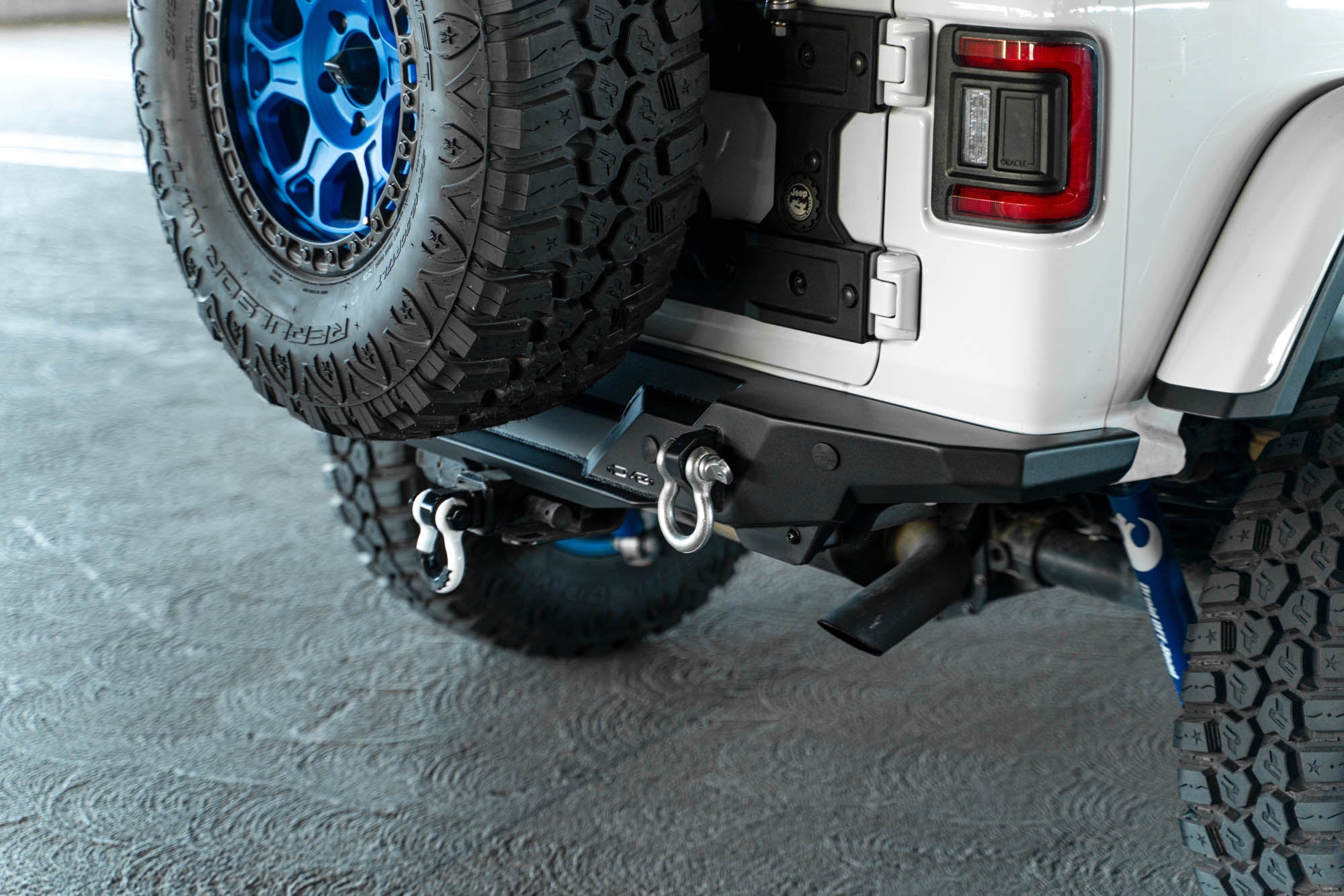 Our FS-15 Rear Bumper features a low profile design suited for aggressive rock crawling. The bumper includes a license plate relocation bracket with a license plate light. The factory hitch and harness fit perfectly in an accessible position beneath the FS-15. For models equipped with factory sensors, we included sensor cutouts to retain full functionality of the feature. For models without factory sensors, we include sensor hole plugs for a clean look. Up to a 37-inch spare tire will fit on the OEM carrier above the bumper.