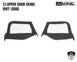 Premium Upper Door Skins Black Diamond Passenger and Driver Side Jeep Wrangler TJ 1997-2006. Features 24 oz Marine Grade Water Proof UV Stable Two Layer Fabric, Pressed and Polished DOT Approved Flexible Glass, Marine Grade Stitching with Heat Sealed Seams, Bindless Self Correcting Nylon Reinforced Zippers with Industrial Grade Velcro Fiber