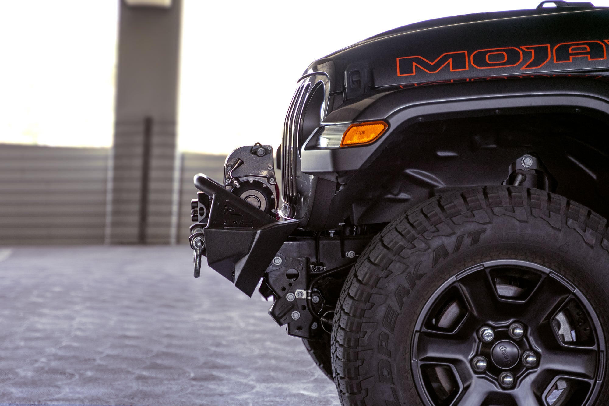 This stubby winch front bumper was designed to maintain good clearance off-road, recovery options, and supplemental lighting. It is compatible with the Wrangler JK & JL, as well as the Gladiator JT. Multiple size winches can be installed in a recessed winch tray behind the protective tubular bull bar. 1-inch thick D-ring mounts that take ?-inch shackle pins provide additional recovery options. An inset light mount in the center of the bumper fits the DV8 Elite 20?, Baja Designs 20?, or Rigid 20? dual row light bars. The bumper is finished in a micro-texture black powder coat, and features a completely bolt-on installation.