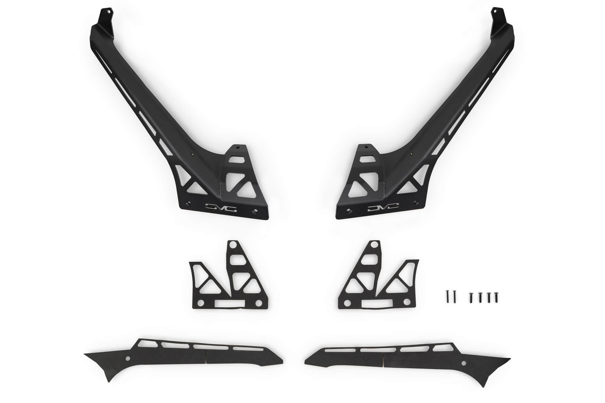 Our low-profile light bar mount lets you attach a 50-inch LED light bar just above your rig's windshield. It's designed to be low-profile to reduce wind noise, but won't block your view. The mount fits most 50-inch light bars and has a hidden channel for tidy wiring. Mount to mount measures 52-inches. It also comes with foam to protect your rig's paint. The 3-bolt setup keeps the light bar secure on rough roads. The black powder coating prevents rust, and it's easy to install on factory bolt hole locations. These were designed for use with our A-Pillar Dual Light Pod Mounts (optional) to provide maximum trail lighting.