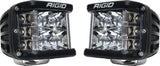 One of RIGIDs most versatile, compact lighting solutions just got better with the RIGID D-SS PRO, Dually-Side Shooter LED pod light. Perfect for any application that requires a wide spread beam, including A-Pillars, fog lights, and motorcycle applications. The D-SS PRO incorporates powerful optics and recently improved LED technology for greater output with the added benefit of additional LEDs aimed to the side for a much broader beam. The D-SS PRO packs a powerful punch with up to 102 percent more raw lumens. The D-SS PRO feature 120-degrees of horizontal lighting coverage. The main forward-facing LEDs are available with RIGIDs advanced Spot, Flood, or Driving optics, so there is a D-SS PRO lighting solution for nearly any application. The D-SS PRO LED lights are available in pairs with three side-shooting LEDs on one side of each light, or in single applications with a pair of side-shooting LEDs on both sides of the light. Only RIGID provides a broad, powerful lighting solution in such a compact package. Own The Night with RIGIDs original side shooter LED light.