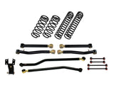 The front and rear axles are properly centered under the vehicle with new heavy-duty adjustable track bars rather than inferior drop brackets that regularly break due to the leverage put on them. All of Rusty’s JL suspension kits come with the Rusty’s track bar frame brace, Jeep has had issues with the factory mount ripping from the frame, with the frame brace you can have peace of mind that you never will have a failure. The front and rear axles are secured by a set of Rusty’s beefy 2 inch DOM adjustable lower control arms. These arms correct the wheelbase after being lifted an enable the pinion angle and castor to be properly “dialed in”.