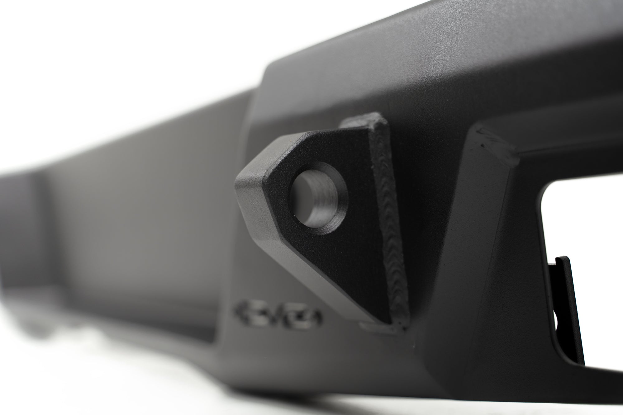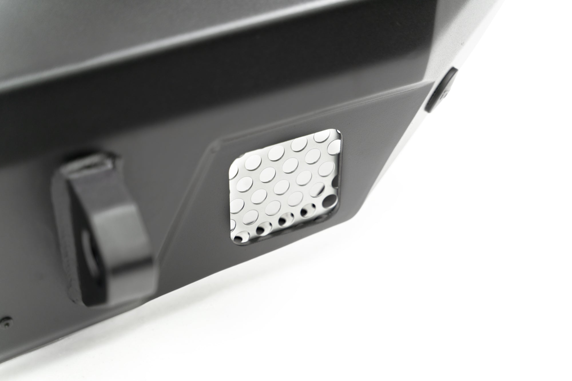 Our FS-7 Series Rear Bumper features a sleek, mid-width design. The FS-7 can fit up to a 37-inch spare tire above the bumper using the factory carrier. The bumper includes a license plate bracket with a license plate light to relocate the plate over to the side away from your spare tire. A pair of 1-inch thick reinforced mounts for D-ring shackles provide recovery options. Rear lighting options include (2) 3-inch pod light mounts that sit in a shielded position behind perforated aluminum accent panels. Welded zip tie tabs provide clean wire management.